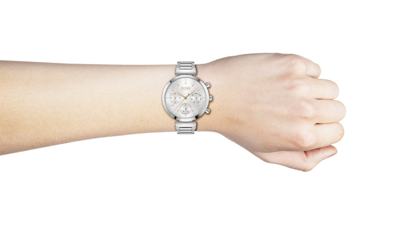 Dit Hugo Boss horloge is gemaakt van staal en heeft een kastbreedte van 36 mm (zonder de kroon meegemeten). Het is voorzien van mineraal glas en wordt aangedreven door een quartz uurwerk. De horlogeband is gemaakt van roestvrijstaal. Het horloge heeft een dag-en datumaanduiding.
