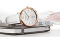 Wijzerplaat: Zilver met roségoudkleurige indexen en wijzers; Arabisch cijfer op 12 uur