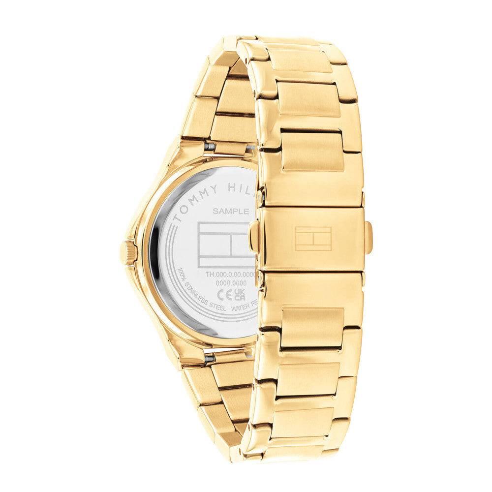 Wijzerplaat: Goudkleurig met het Tommy Hilfiger logo en subtiele kristallen accenten rond de lunette
