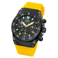 Kastdiameter 44 mm van hoogwaardig 316L staal (PVD‑titanium‑look), dubbel‑laag grijze sunray wijzerplaat, gele rubberen band .