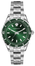 Een sportief herenhorloge van het Italiaanse luxemerk Versace, met een 42mm brede edelstalen horlogekast die 50 meter waterdicht is, waardoor het rustig kletsnat mag worden. Het horloge heeft een groene wijzerplaat, datumaanduiding en krasvast saffierglas.